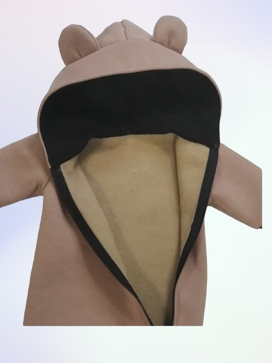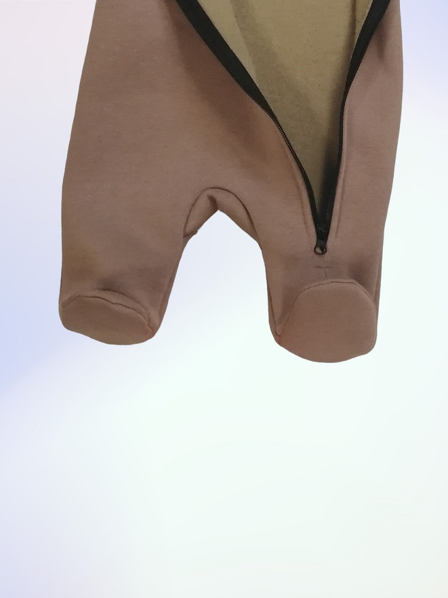 Комбинезон выполнен из футера двухнитки с начёсом. Спереди косая молния, капюшон на подкладке. У комбинезона закрытые ножки, на рукавах манжеты.