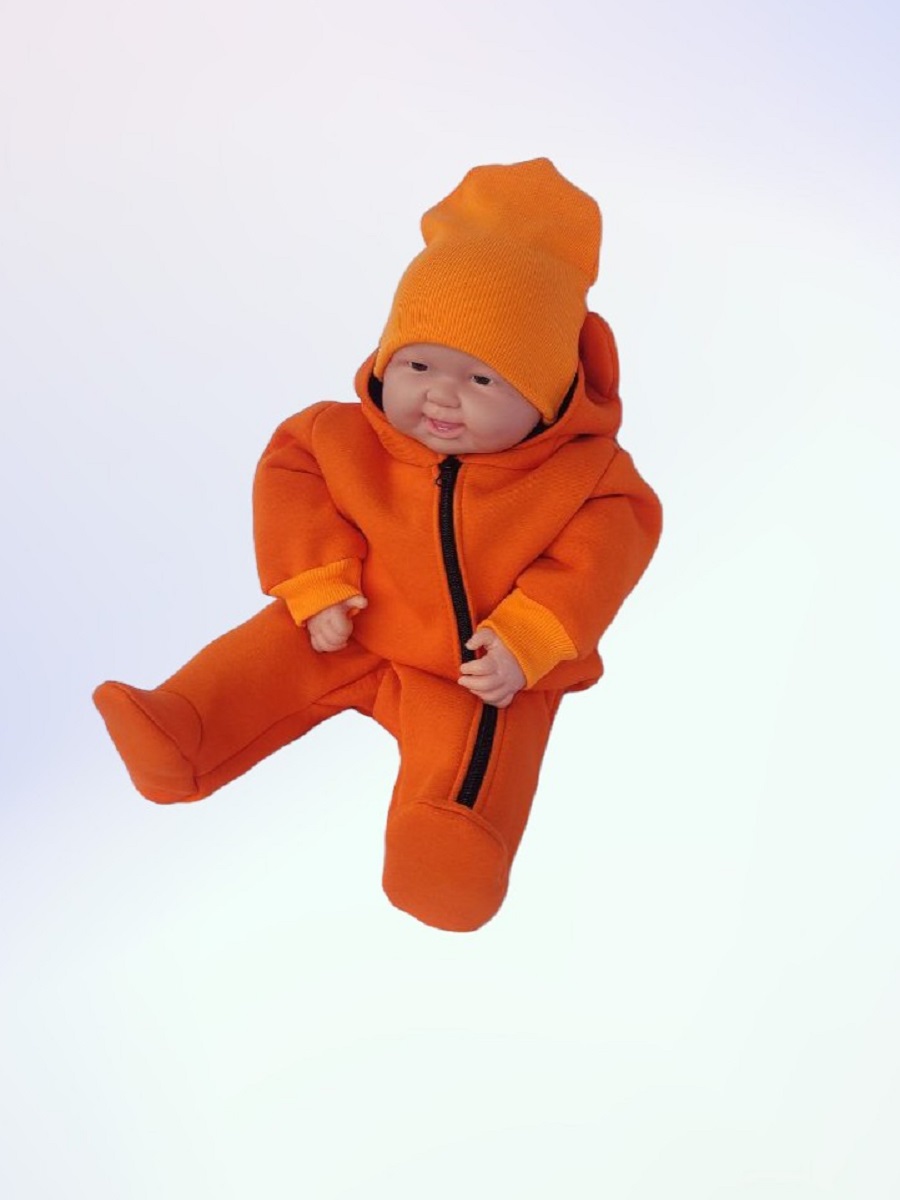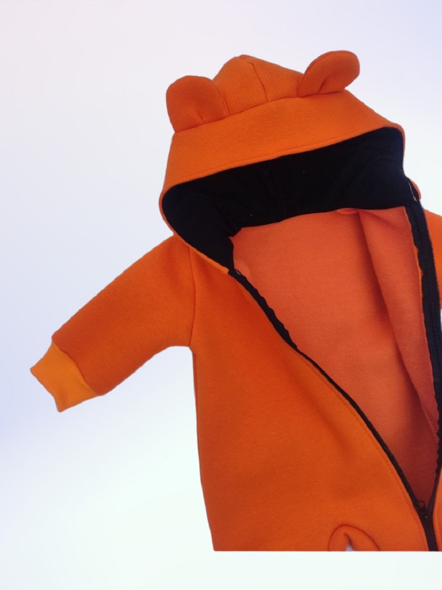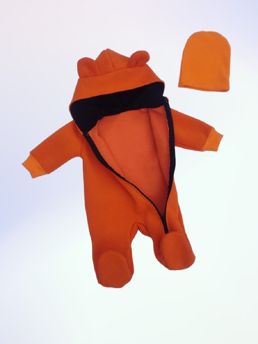 "МоёДитё" комбинезон выполнен из футера с начёсом. Комбинезон с капюшоном на подкладке и декорирован сверху ушками, с закрытыми ножками, рукава на манжетах, спереди косая молния до конца одной ножки. Шапочка из кашкорсе можно одевать как с отворотом, так и без. Очень хорошо тянется.