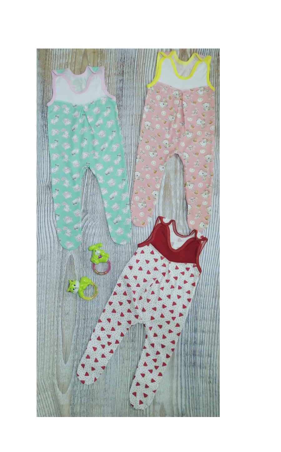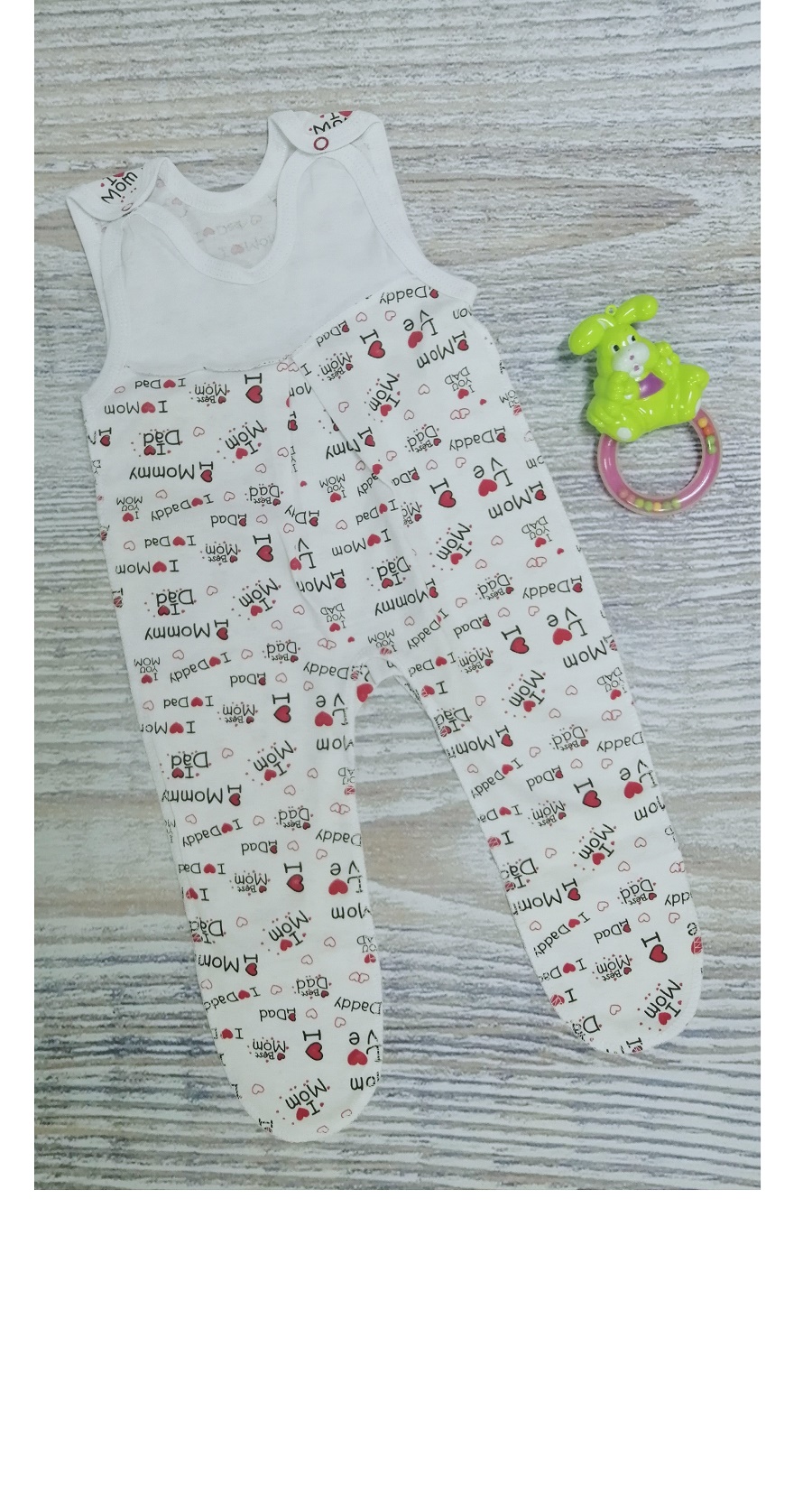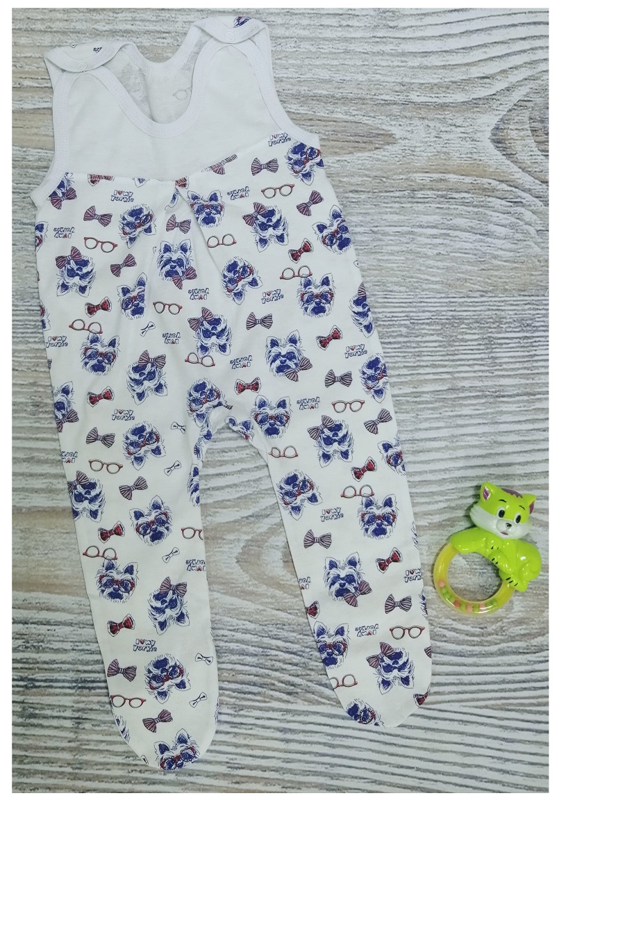 Ползунки выполнены из 100% хлопка (кулирка), сверху на кокетке, на плечиках на кнопочках.